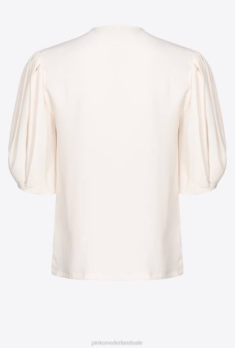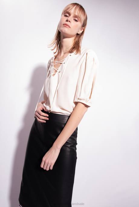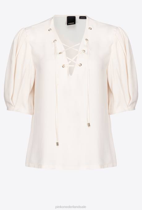 Blouse Van Crêpe De Chine Van Zijdemix Met Metalen Oogjes Versierd, Diepe V-hals En Dunne Gekruiste Veters. Recht Gesneden Mouwen Met Korte Pofmouwen. Dit Stuk Is Gemaakt Van Materiaal - Gecertificeerd In De Hele Productieketen - Uit Bossen Die Worden Beheerd In Overeenstemming Met Duurzaamheidsprincipes.