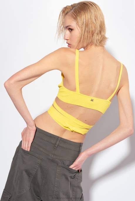Bralettetop Van Ribgebreide Viscose-crêpe Met Stretch. Diepe V-hals Aan De Voorkant, Rechte Halslijn Aan De Achterkant En Plaquette Met Het Logo Van Liefdesvogels. Lange Strikveters Aan De Onderkant. - Model Is 175cm Lang En Draagt maat 40.