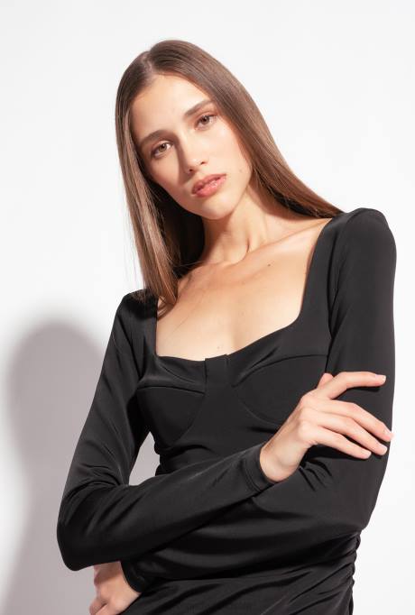 Kuitlange Jurk Van Vloeiende Technische Viscose Met Stretch En Een Kenmerkende Structuur In Neopreenlook. Slim Fit, Een Vierkante Hals Met Voorgevormde Cups In Corset-look, Lange Mouwen En Een Split In De Achterzoom. Verborgen Centrale Ritssluiting Op De Rug.