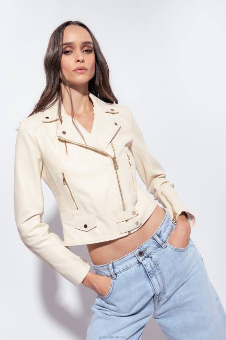 Jack In Bikerstijl Van Nappaleer, Met Metalen Knopen Bij De Hals. Zakken Met Metalen Ritssluiting, Bandjes Met Knoop Aan De Manchetten En Mouwen Met Ritssluiting En Bandje Aan Het Einde. Stoffen Voering En Gouden Hardware. Asymmetrische Ritssluiting. Dit Kledingstuk Is Gemaakt Van Leerlooierijmaterialen Die Milieuvriendelijke Productie En Duurzame Bedrijfspraktijken Bevorderen. - Model Is 178cm Lang En Draagt ​​maat 40.