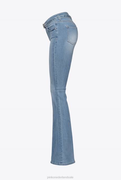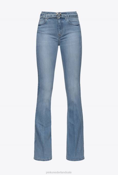 Flare-fit, Blauwe Stretchjeans Met Vijf Zakken En Lichte Wassing. Normale Taille Met Riemlussen, Riem Van Bijpassende Stof Met Mini-liefdesvogels, Diamantgeslepen Gesp En Nauwsluitende Pijpen Die Uitlopen Naar De Onderkant. Metalen Rits En Tack-knop Sluiting.